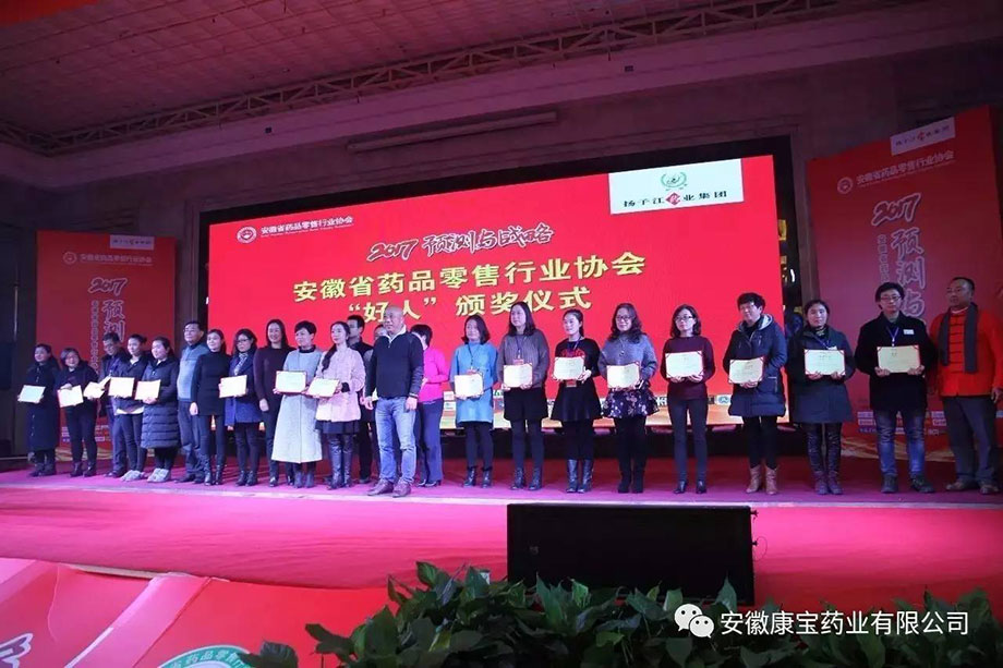 歲末好事不斷,康寶獲獎連連。12月26日,由省藥品零售行業(yè)協(xié)會主辦的安徽省藥品零售企業(yè)“好人 好企業(yè)”頒獎典禮在省城合肥隆重舉行。淮南東方醫(yī)院集團全資子公司康寶藥業(yè)通過逐級推薦、層層考核、公開評審等程序,最終被評為“好企業(yè)”稱號,康寶藥業(yè)員工青春嬌、李洪被評為“好人”稱號。