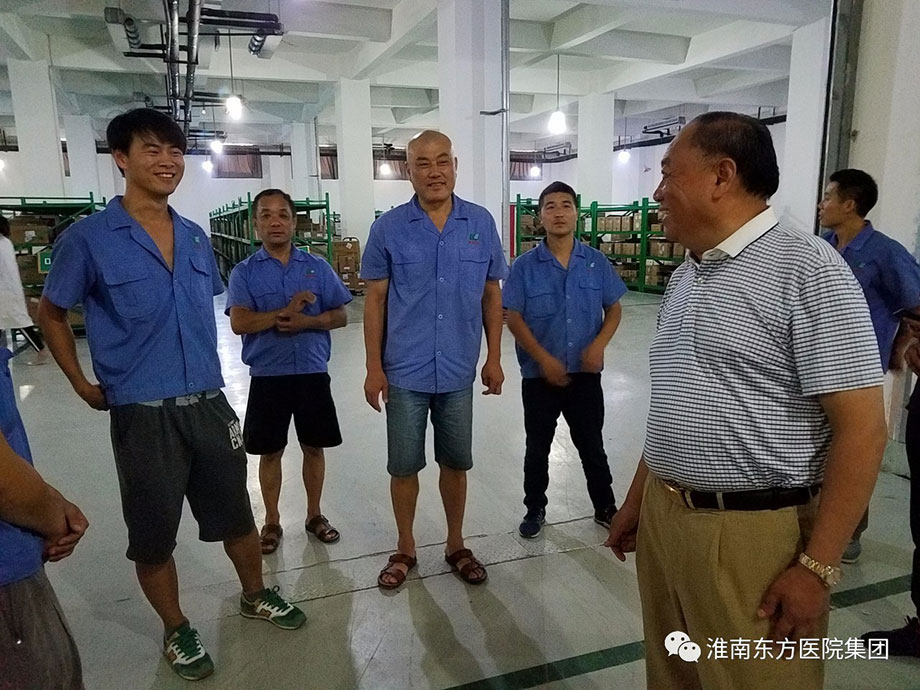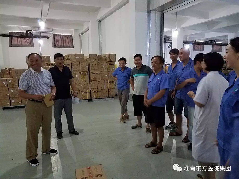 “大計劃”第三天,是進出貨的高峰期,也是倉儲部最為忙碌的一天。當天下午,室外溫度高達41度,醫院集團董事長江鴻方,集團董事、總院院長王多為,集團董事、總院黨委書記、康寶藥業董事長朱興林一行冒著烈日,來到公司倉儲部,與一線員工親切握手,并把慰問物品和慰問金送到員工手中,讓大家在悶熱的環境里享受絲絲的清涼。