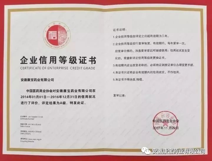 11月29日,中國醫藥商業協會在2017中國藥品流通行業年度大會上公布了“2017年中國企業信用等級評價”結果,最終有13家企業獲得評級認定,安徽康寶藥業有限公司喜獲A級企業信用評級。